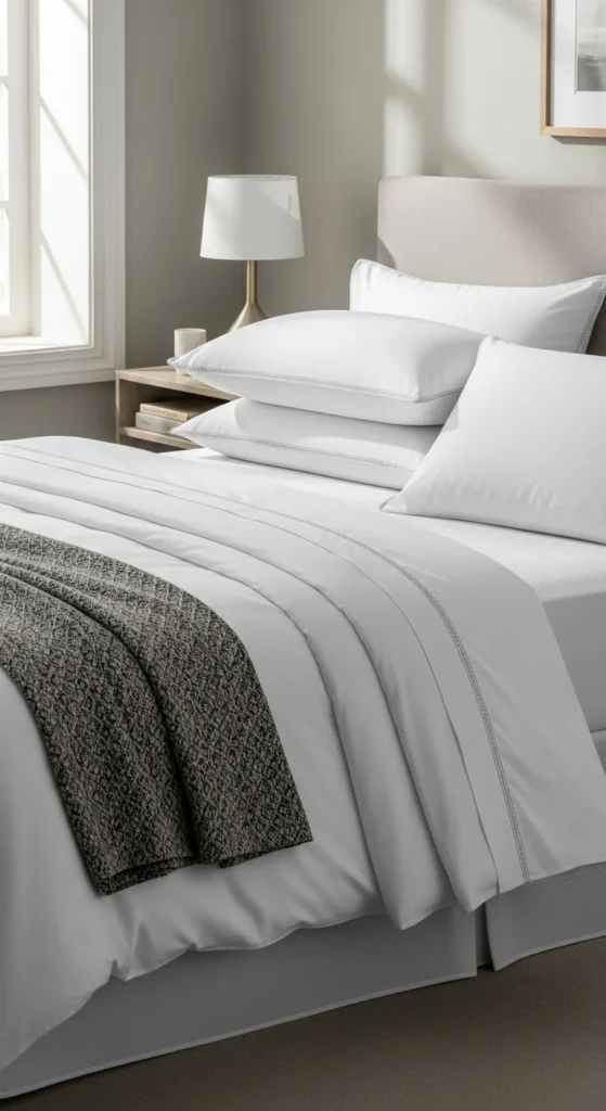 Percale bedding feels clean and structured. White highlights the bed’s lines and proportions. Add one textured throw or cushion to avoid flatness. Keep layers minimal. This approach works with any palette. Replacing sheets alone can update the entire bed without buying new furniture. The bed looks intentional and tailored.