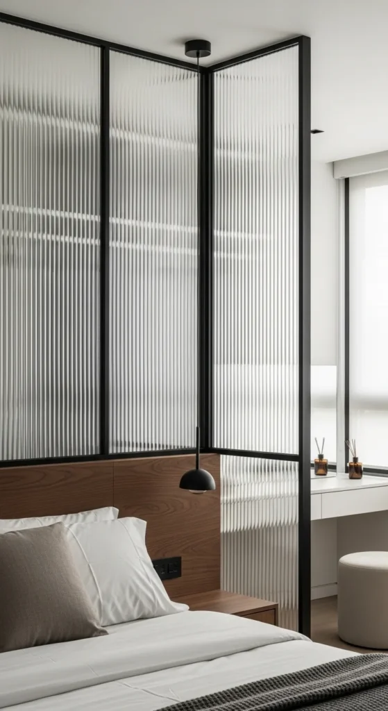 Fluted glass creates separation without blocking light. It works well for dressing areas or seating zones. The vertical texture adds subtle interest. Prefabricated panels make this accessible. Use neutral frames to keep it understated. This adds structure while keeping the room visually open.