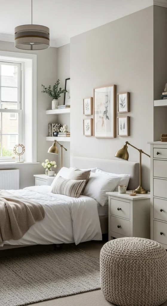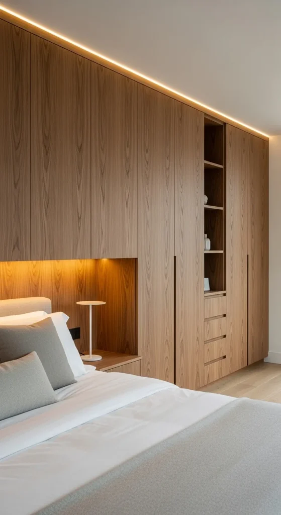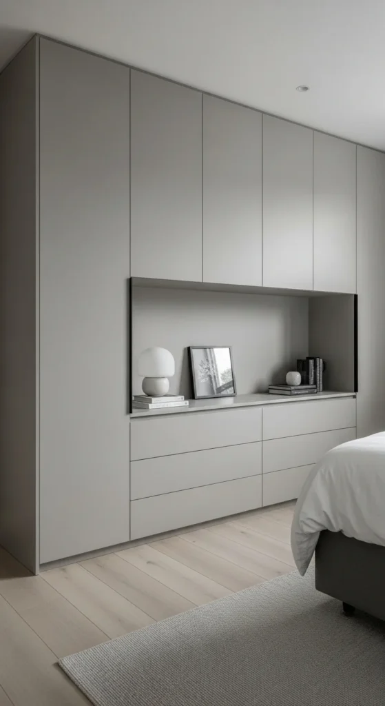 Built-ins keep storage seamless. Flush fronts reduce visual breaks and clutter. If custom work isn’t possible, use wardrobes with handleless designs. Painting them the same color as walls helps them recede. Storage that blends in supports a calm layout.