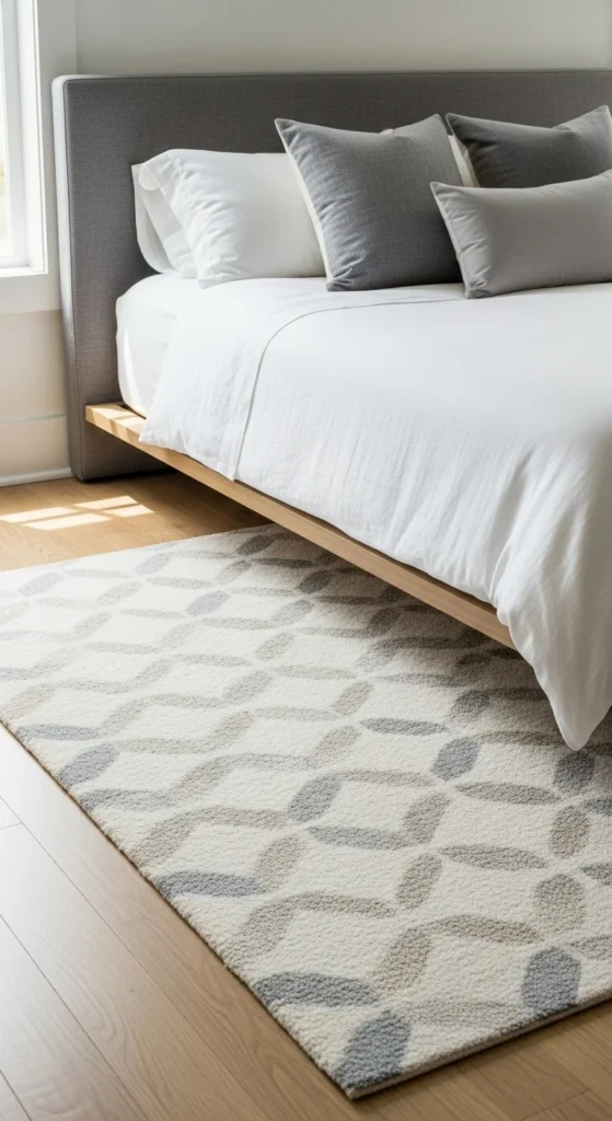 Low-pile rugs define space without adding bulk. Subtle geometric patterns add interest while staying calm. Choose colors close to the floor tone. Make sure the rug extends beyond the bed. For savings, layer a smaller patterned rug over a plain base rug. This adds depth without cost overload.
