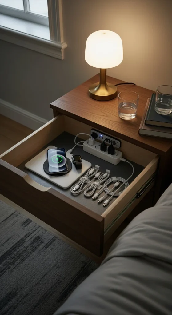 Visible cords disrupt modern bedrooms. Hidden charging inside drawers or boxes keeps surfaces clean. Cable organizers are inexpensive and easy to install. This change improves both function and appearance. Clear nightstands feel intentional and calm.