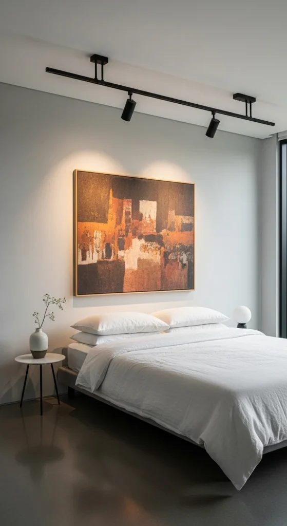 Track lighting adds flexibility and control. Aim light toward walls or art rather than directly over the bed. Matte finishes keep it subtle. This supports layered lighting without extra lamps.