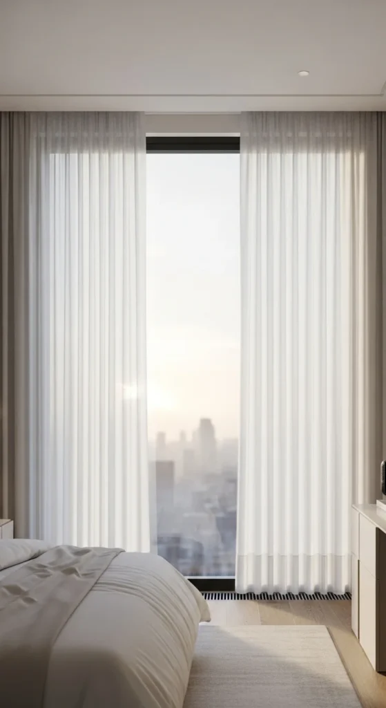 Sheer curtains soften modern rooms and add height. Hanging rods near the ceiling makes walls appear taller. Light fabric keeps the look airy. Even non-blackout panels add structure. This upgrade is simple and widely available at most price points.