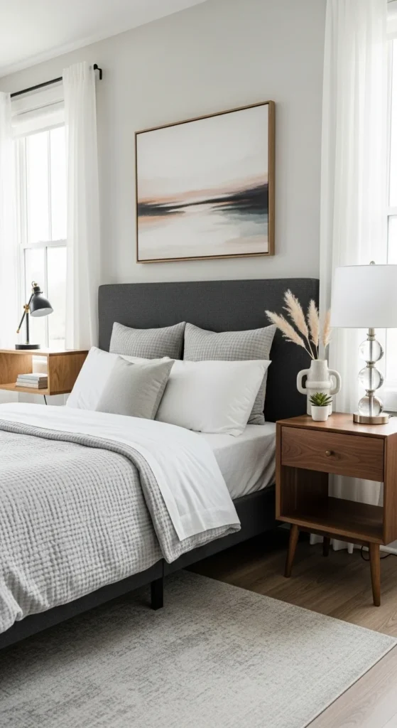 A single large art piece creates focus without clutter. It works better than several smaller frames in modern bedrooms. Abstract designs feel calm and timeless because they don’t tell a literal story. Choose muted tones that echo the bedding or wall color. Hang the artwork slightly lower than usual so it visually connects to the bed. For a budget option, print high-resolution art and use a simple oversized frame. Thrift stores also offer large canvases that can be painted over. One intentional piece gives the room structure and polish without filling every wall.