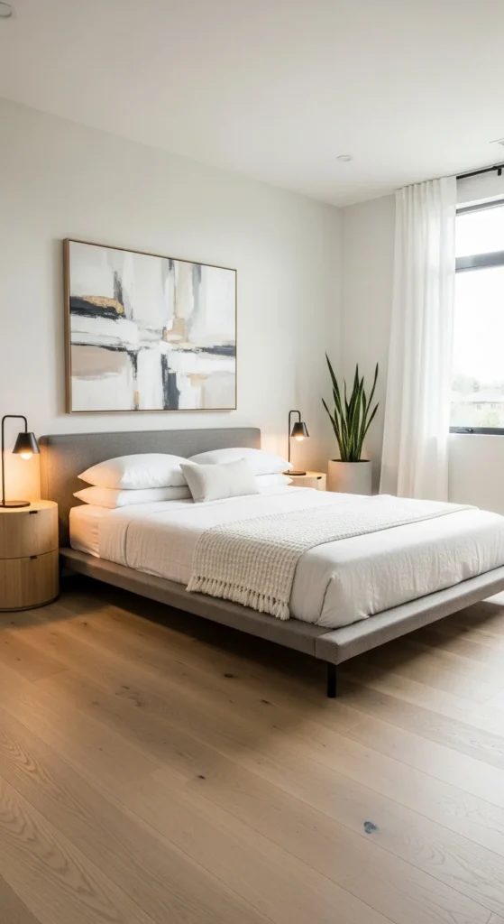 Wide planks reduce visual breaks across the floor. This makes the bedroom feel calmer and more open. Light wood tones pair well with modern palettes. If replacing flooring isn’t realistic, use wood-look laminate or vinyl planks. These options offer a similar appearance at a lower cost. Keep rugs simple so the flooring remains visible. A clean floor base supports the entire room design.