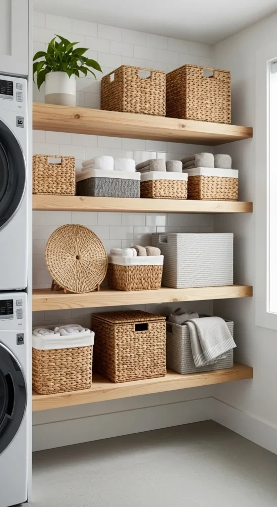 Open shelving can look modern when kept simple and uncluttered. Limit shelves to a few essentials instead of filling every wall. Use matching baskets or bins to keep items grouped and tidy. Neutral containers maintain a clean look while hiding everyday supplies. Styling shelves with folded towels or glass jars adds texture without crowding the space. Keep color palettes consistent so shelves feel intentional. Avoid mixing too many materials or patterns. This approach keeps storage functional while still looking styled and organized.