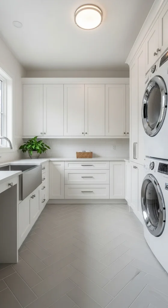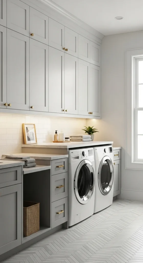 Herringbone tile adds pattern in a subtle, structured way. The repeating angles create movement without feeling busy. Neutral tones like gray or beige keep the pattern refined. Tile is durable and easy to clean, which suits a laundry area. Peel-and-stick versions can mimic this style on a smaller budget. Pair the floor with simple cabinets to let the pattern stand out. The texture adds personality while still fitting a modern design. This flooring choice gives the room a custom feel.