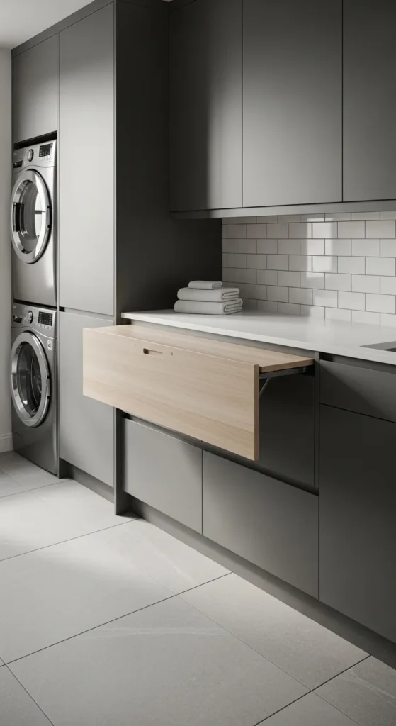 A built-in folding station creates a dedicated workspace for laundry tasks. Placing it between cabinets gives the counter a custom appearance. Butcher block adds warmth, while white laminate keeps the look crisp. Keeping the surface mostly clear maintains the sleek style. Add a small tray or basket for loose items. This setup keeps folding contained in one area instead of spreading clothes around the house. A defined work zone helps the room stay organized and efficient.