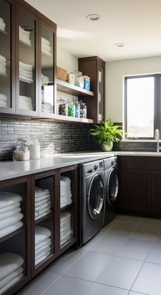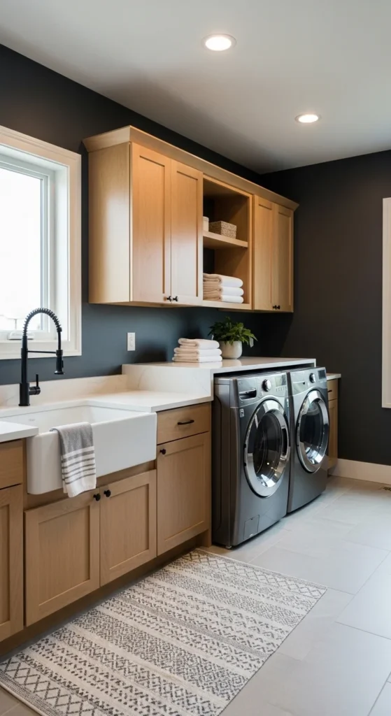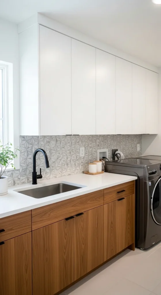 Two-tone cabinetry adds visual interest while keeping the room feeling balanced. Light upper cabinets help the space feel open and airy. Darker or wood-tone lower cabinets ground the design and hide scuffs better. This contrast creates depth without relying on busy patterns. Painting only the lower cabinets a darker shade is an affordable way to try the look. Pairing warm wood tones with white uppers softens the modern style and keeps it welcoming. Keep hardware consistent across both colors to tie everything together. This approach works well in both small and larger laundry rooms. The mix of tones gives the space a designer feel without extra décor.