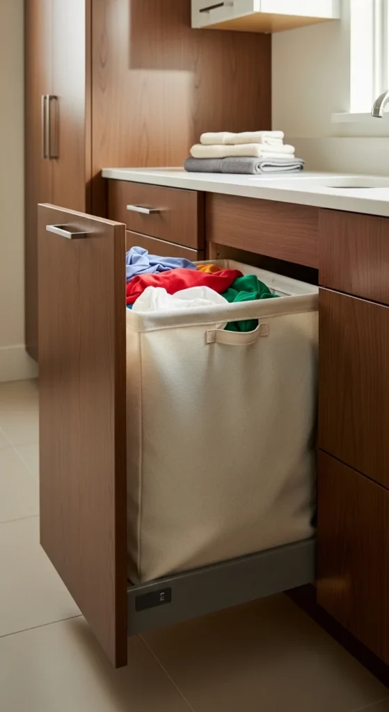 Hidden pull-out hampers keep laundry out of sight while preserving clean cabinet lines. Installed behind a lower cabinet door, the hamper slides forward smoothly when needed and disappears when closed. This setup prevents bulky baskets from crowding the floor and interrupting the room’s streamlined look. You can install slide-out frames that hold removable bins, making it easy to carry loads to the washer. Using two compartments allows simple sorting for lights and darks. Many hardware kits are affordable and fit inside standard base cabinets. If cabinetry is not available, a tilt-out hamper cabinet offers a similar effect. Keeping dirty laundry concealed helps the entire room appear more organized and visually calm.