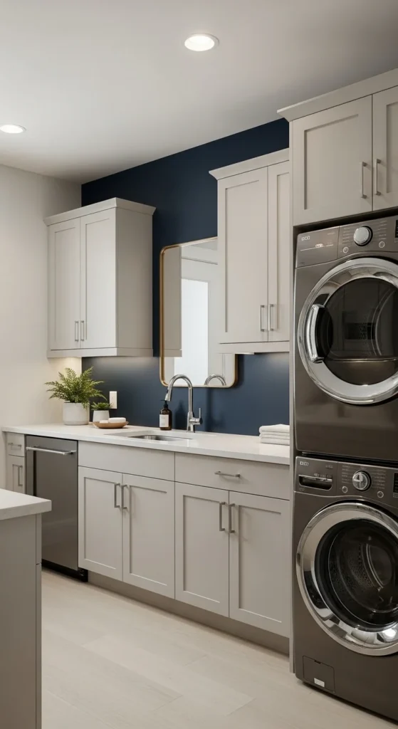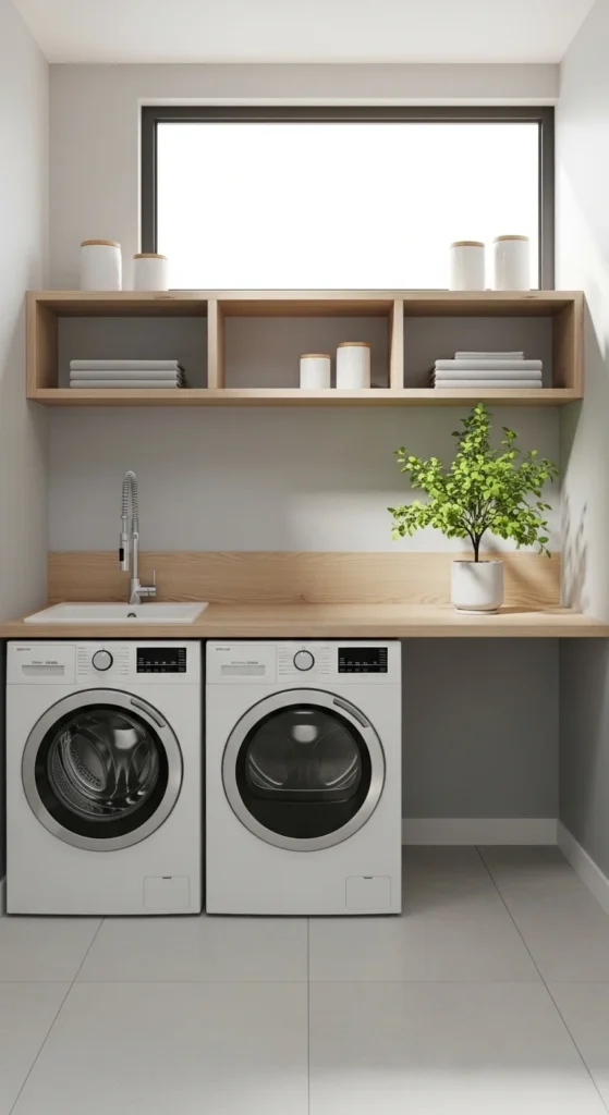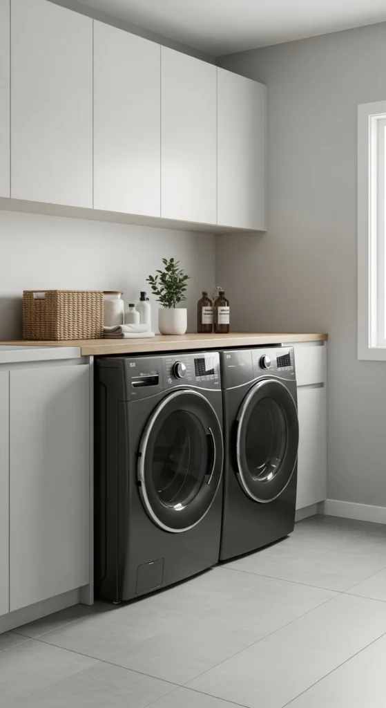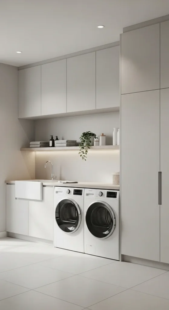 Keeping décor minimal supports a clean and modern aesthetic. A small potted plant introduces a natural element without crowding surfaces. Choose low-maintenance greenery that tolerates humidity and indirect light. One or two decorative items are enough to soften the space. Too many accessories can make the room feel busy. A restrained approach keeps the focus on clean lines and organized storage. The result is a laundry area that feels calm, fresh, and thoughtfully designed.