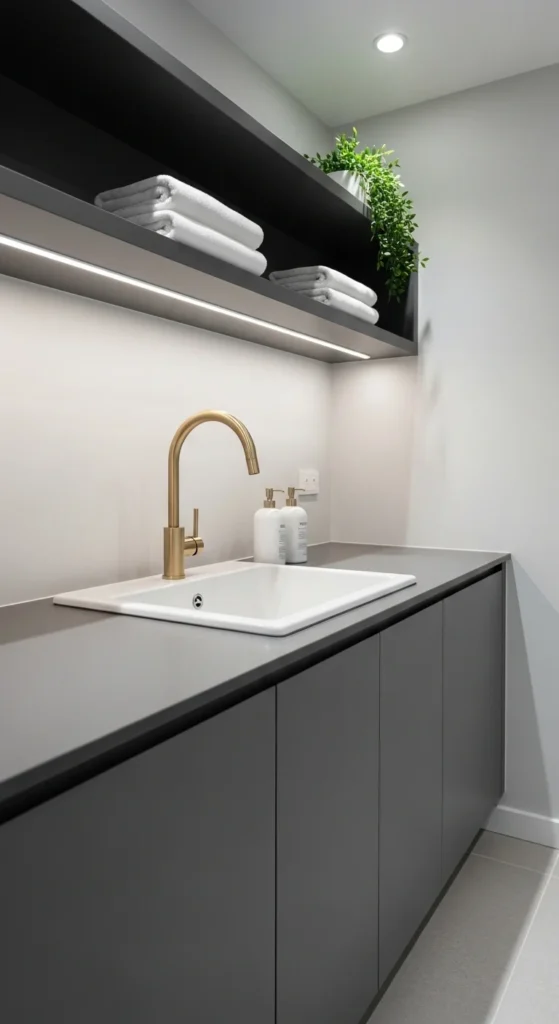 A compact utility sink can look stylish while still being practical. Choose a rectangular basin with straight edges for a modern profile. Pair it with a faucet in brushed brass or matte black to match other finishes in the room. Wall-mounted or undermount styles keep the countertop looking streamlined. Even a small sink is useful for hand-washing delicates or treating stains. Add a simple shelf above for soap and brushes to keep the area organized. With the right materials, the sink becomes a design feature rather than just a utility item.