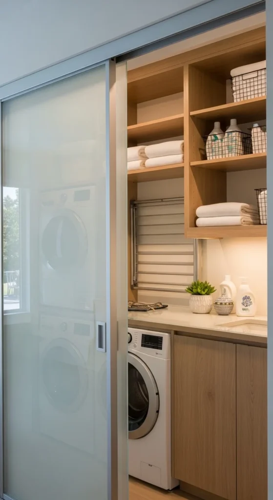Pocket or sliding doors keep the layout sleek by eliminating the swing space of traditional doors. This is especially helpful in narrow hallways or compact laundry closets. Frosted glass panels add a modern touch while allowing light to pass through. When closed, the doors create a smooth surface that blends into the wall. Barn-style sliding doors on a simple metal track can offer a similar effect without major wall changes. This design detail keeps the room accessible while maintaining a streamlined appearance.