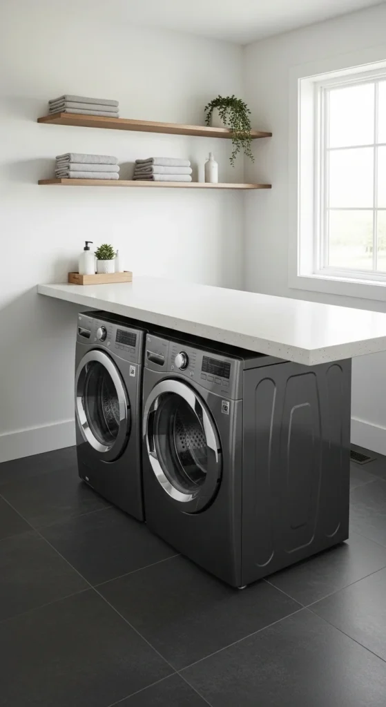 A floating countertop over front-load machines creates a sleek, continuous folding surface. Wall-mounted brackets hold the counter while leaving open space beneath, which keeps the design light. Simple materials like laminate or wood with a clear finish can look modern when edges are kept straight. This surface helps contain folding tasks in one place. Keeping it mostly clear preserves the streamlined look. The floating style avoids bulky cabinetry and keeps the room feeling open.