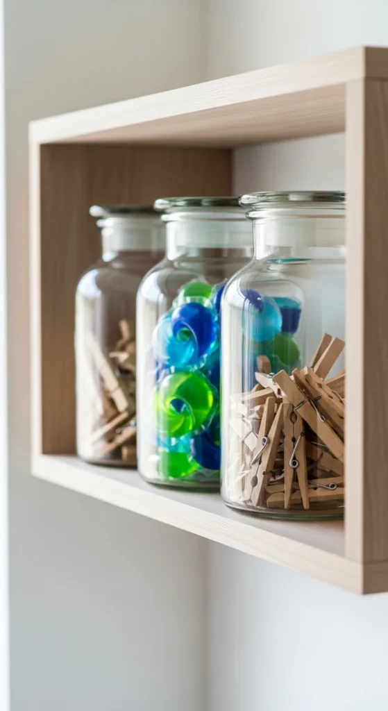 Matching storage jars turn common supplies into part of the décor. Clear glass containers keep pods and clothespins visible while reducing packaging clutter. Using the same jar style across shelves creates visual consistency. Lids protect contents from moisture and dust. Placing jars on open shelving keeps essentials close while maintaining a neat appearance. Practical storage can still look intentional when containers match the room’s design.