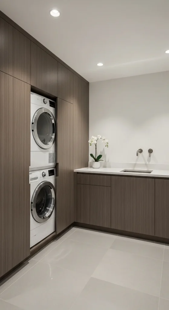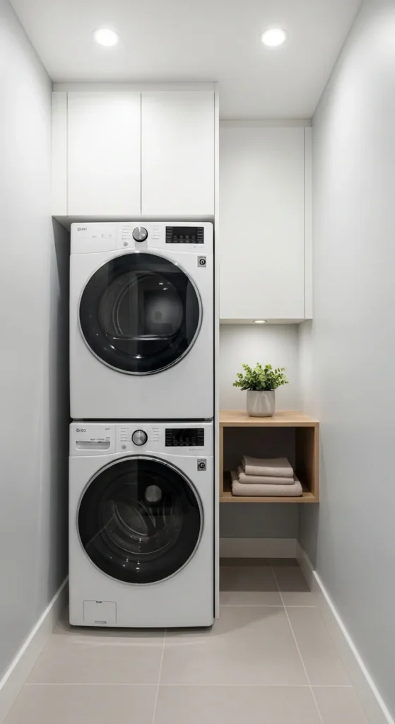 Stacked appliances free up floor space and create a tidy vertical layout. This configuration works especially well in small laundry rooms or closets. The extra space beside the machines can hold a slim cabinet or shelf. Stacking also creates a tall, streamlined look that fits modern design styles. Most front-loading machines can be safely stacked with a manufacturer kit. Keeping the surrounding area uncluttered highlights the clean lines of the setup. A small step stool can help reach upper controls if needed. This layout balances style and practicality in tight spaces.