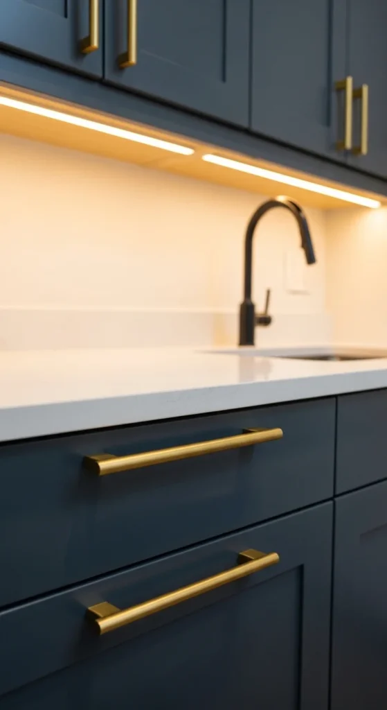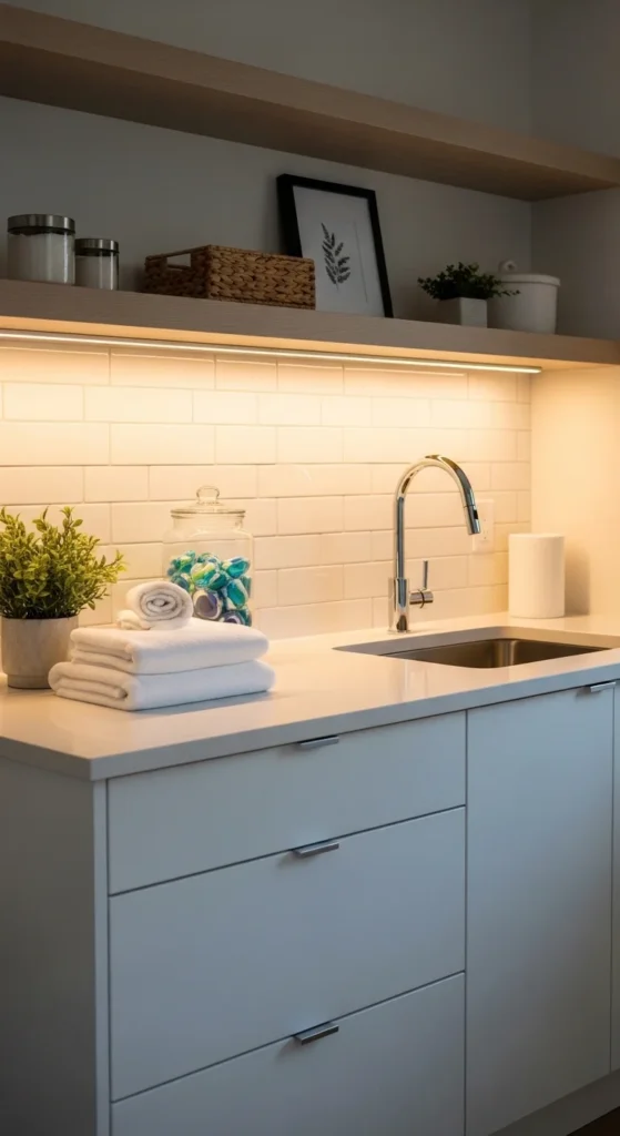 Under-cabinet lighting brightens countertops and makes tasks easier to see. LED strips are slim and easy to install with adhesive backing. Warm white light adds a soft glow, while cool white improves visibility for stain checking. Hidden lighting also highlights backsplash details and countertops. This layered lighting makes the room feel more finished and less like a utility space. Battery or plug-in options avoid complicated wiring. Even a small amount of added light can change the mood of the room. The space feels brighter, cleaner, and more inviting with this simple upgrade.