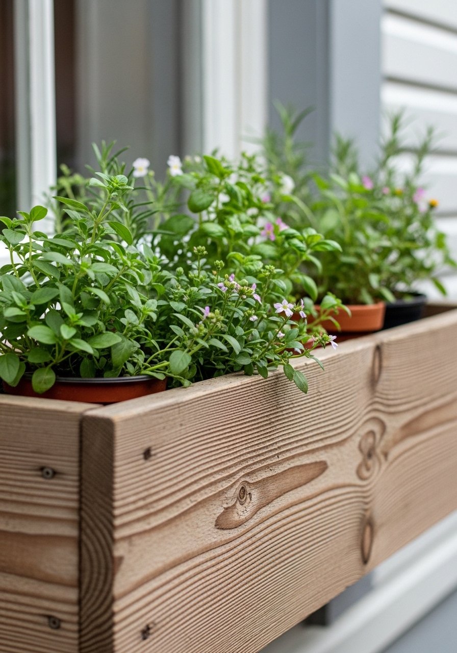 I nailed cheap cedar window boxes myself and planted rosemary, thyme, and thyme again. They softened the facade and smelled amazing when I trimmed them. I once overwatered and the boxes rotted—so I added liners.