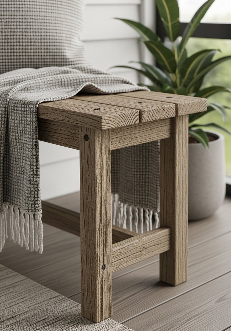 I replaced my plastic chair with a simple weathered wood bench. It made the porch feel like it had personality. I tried a painted bench first and it peeled—so I embraced natural aging.