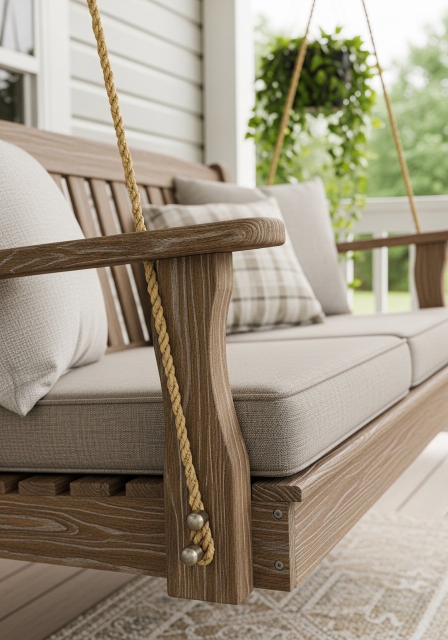 A swing creates a moment. Keep cushions weather-friendly and choose a compact size so the doorway stays clear.