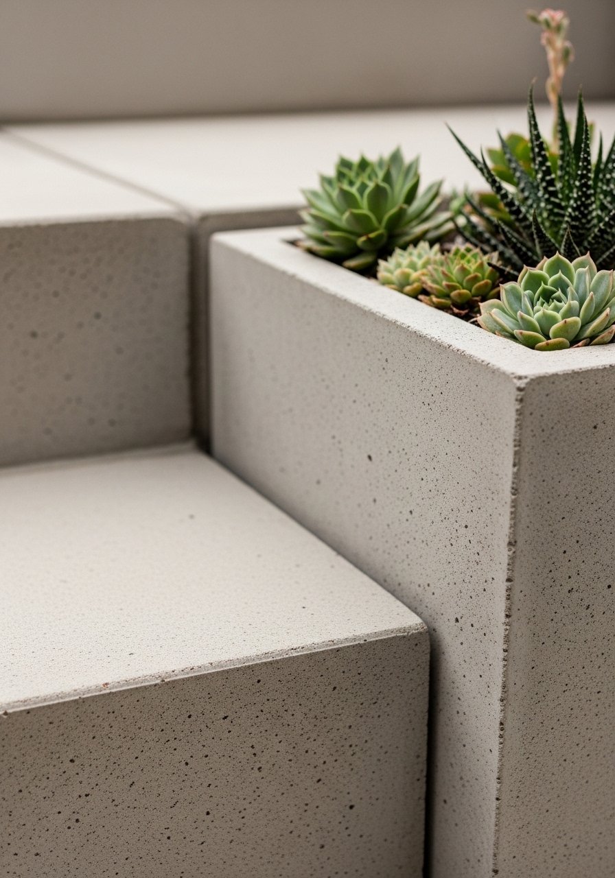 I poured small concrete steps to replace rickety wood and added a rectangular concrete planter. It reads modern and tidy. I overdesigned once—keep shapes simple for small houses.