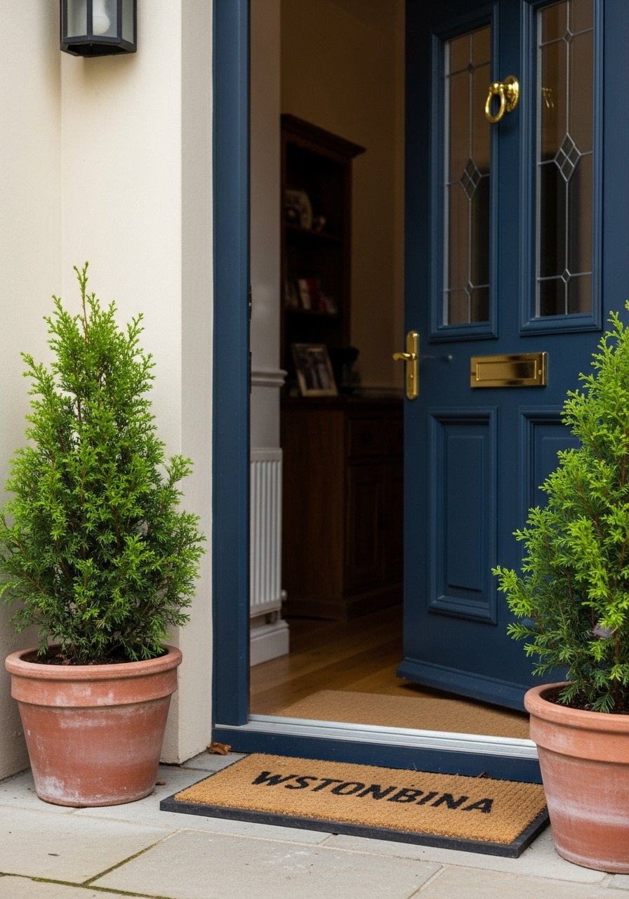 I used potted evergreens on either side of my door. They read consistent year-round and needed little fuss. I originally used different pots and it looked off-balance—matching pots are subtle but effective.