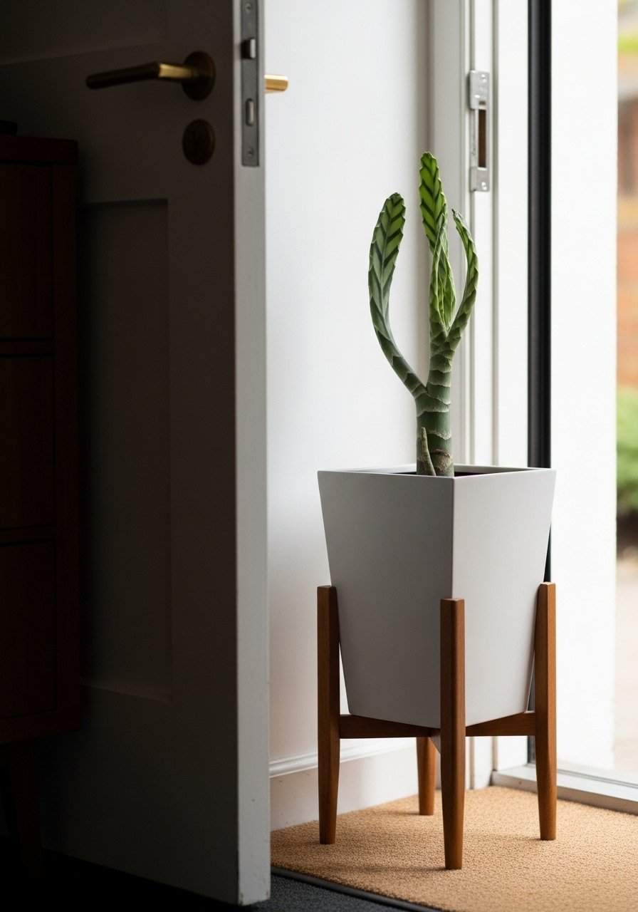 This mid-century look keeps the silhouette simple. Choose one statement planter instead of many small ones.