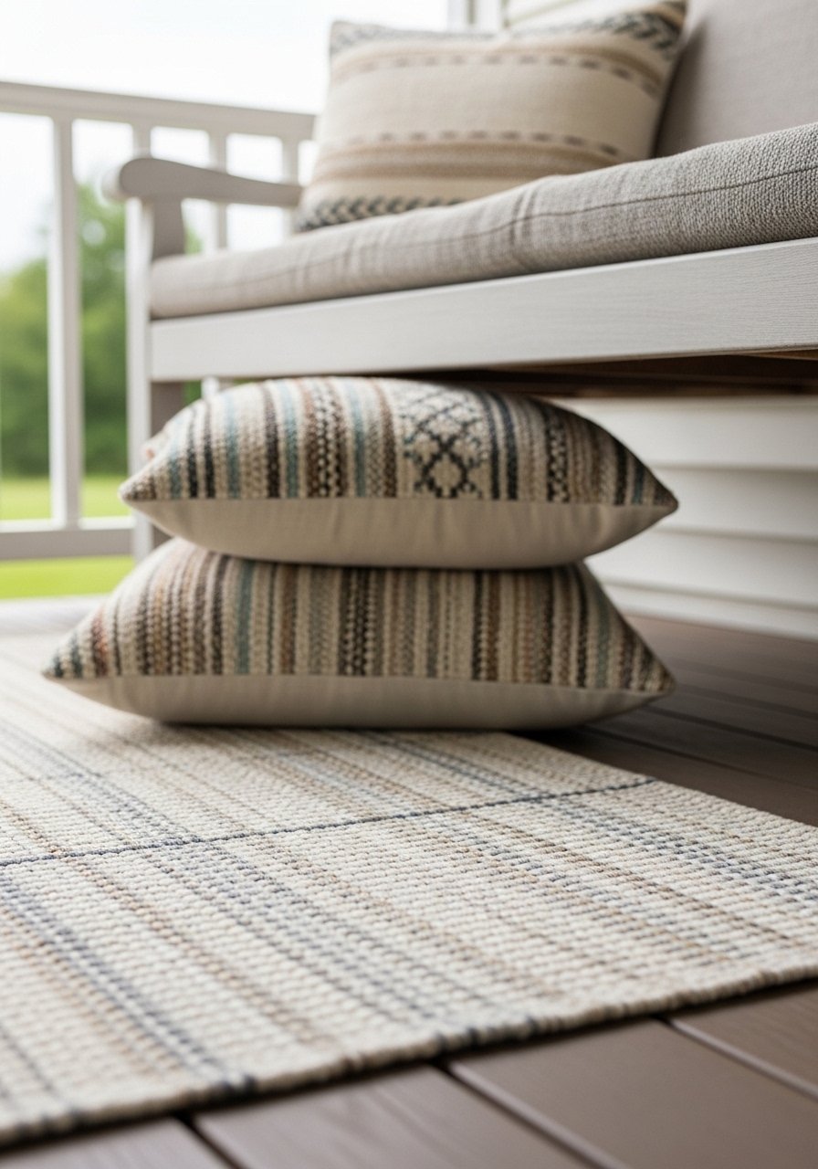 I added a weatherproof rug and a few pillows to my tiny porch bench. It made the space feel like an outdoor room. I once chose busy patterns that clashed—stick to two complementary textures.
