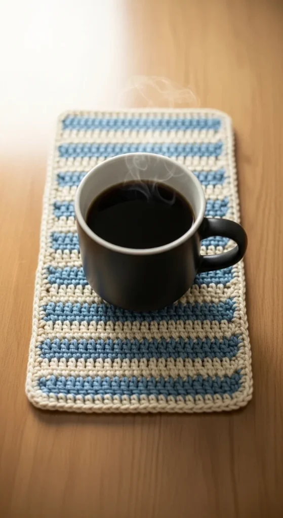 Mug rugs are slightly larger than coasters and give you more space to practice straight rows. They protect surfaces from heat and spills while adding handmade charm to a table or desk. This project is great for improving edge consistency and learning how to keep rows even. You can experiment with stripes using leftover yarn for a playful look. Thicker yarn creates a cozy texture that feels sturdy and durable. Mug rugs are quick enough to finish in one sitting, which keeps motivation high. They also make lovely small gifts when paired with a favorite tea or coffee blend. Simple, useful, and beginner-friendly.