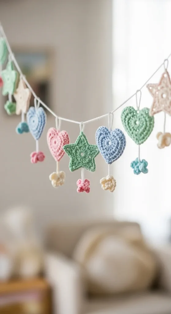Crochet garlands use repeated small shapes like stars, hearts, or circles joined with yarn. This helps beginners practice making consistent pieces over and over. Stringing them together creates a cheerful decoration for rooms or parties. It’s a great way to use leftover yarn in many colors. Each motif works up quickly, so progress feels fast and motivating. You also learn how to attach pieces evenly along a strand. Garlands add handmade warmth to any space. This project is simple, decorative, and very beginner-friendly.