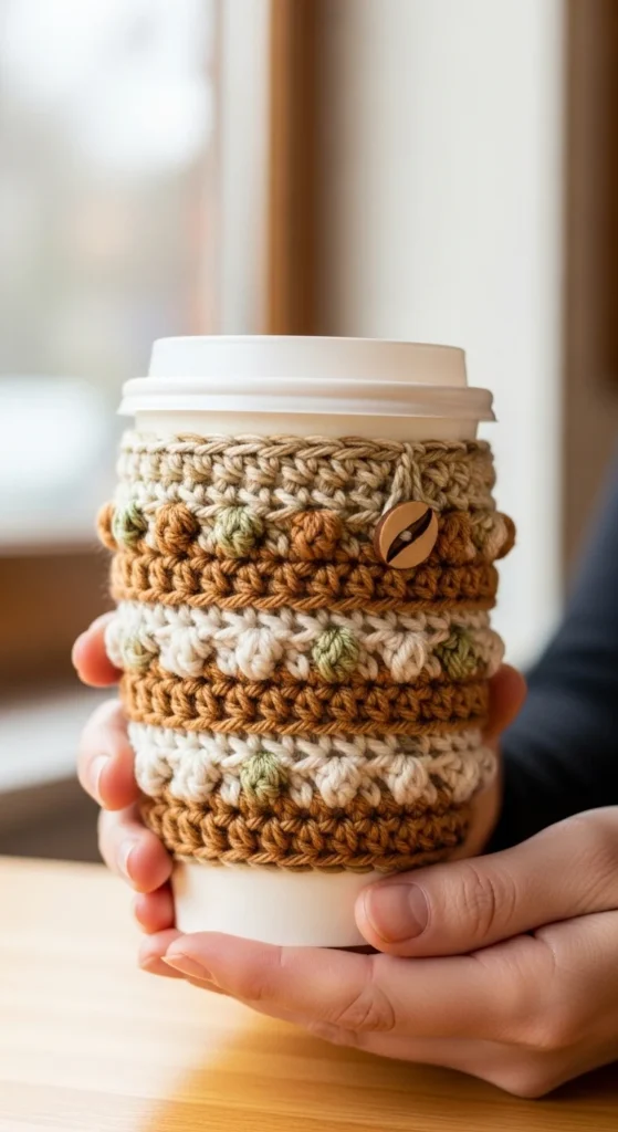 Cup sleeves are quick and practical for hot drinks. A small rectangle sewn into a loop fits most cups. This project introduces measuring and simple seaming. Using thicker yarn gives a cozy texture. Buttons can be added for decoration and adjustability. It’s portable and works up fast. Great for gifting or personal use. It keeps hands comfortable while holding warm drinks.