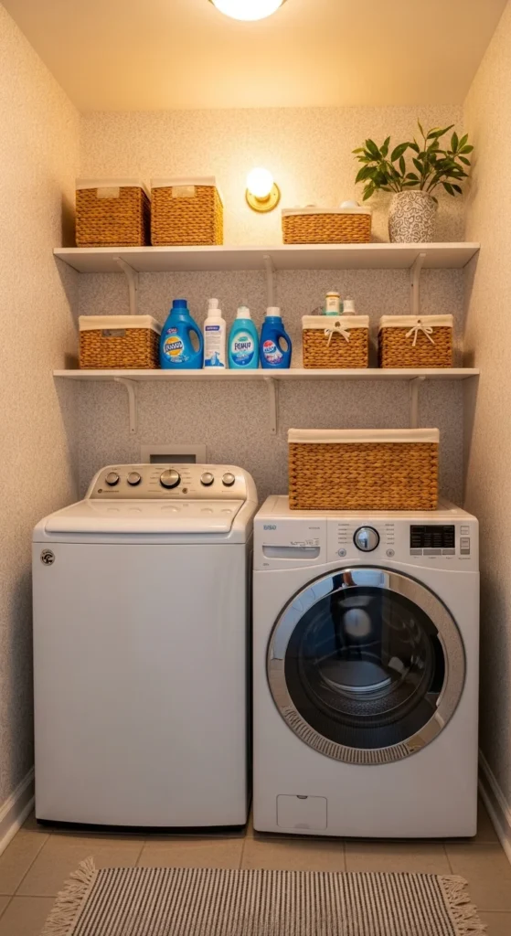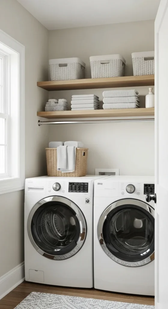 Wall space above the washer and dryer is often empty, yet it is one of the best storage zones in a small laundry room. Floating shelves turn that unused wall into a practical spot for detergents, baskets, and folded linens. Keep everyday items on the lower shelf so they are easy to grab. Store backups higher up. Simple wood boards and sturdy brackets from a hardware store work well and cost far less than custom cabinets. Painting shelves the same color as the wall keeps the room from feeling crowded. Woven baskets hide small items and reduce visual mess, while clear jars make pods and clothespins easy to see. If deep shelves feel bulky, stick with narrow ones that hold essentials without sticking out too far. This upgrade clears clutter from the floor and helps the room feel taller and more open.