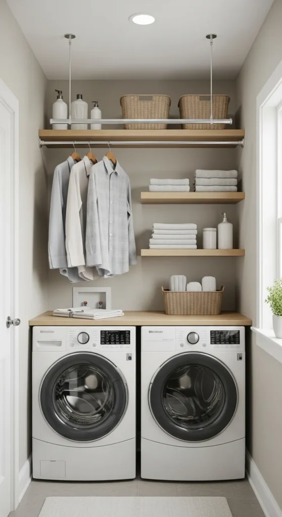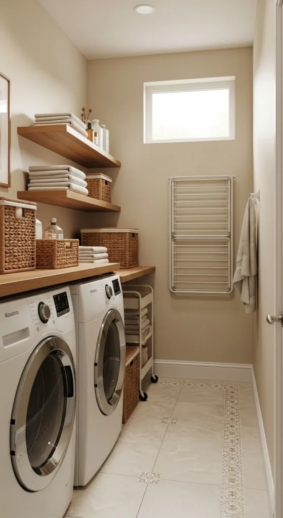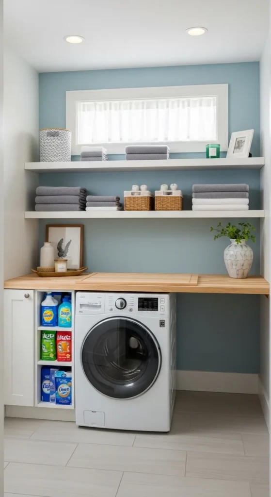 Dividing the room into zones helps daily tasks flow smoothly. Keep washing supplies near the machines, folding space on the counter, and storage above or beside. When each activity has a dedicated area, the room feels more organized and easier to use.