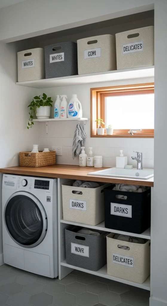 Sorting laundry becomes faster when each category has a designated container. Place fabric or plastic bins on shelves and label them for whites, darks, towels, or delicates. This setup prevents piles from forming on the floor and keeps everything tidy between wash days. Labels can be simple tags, chalkboard stickers, or printed cards slipped into clear holders. Color-coding bins for family members is another helpful trick. Kids can learn to place their clothes in the right spot, which saves you sorting time later. Choose bins with handles so they are easy to pull down from higher shelves. Keeping categories separated also reduces the chance of color bleeding accidents. This system adds structure without requiring extra square footage, making it perfect for small laundry rooms.