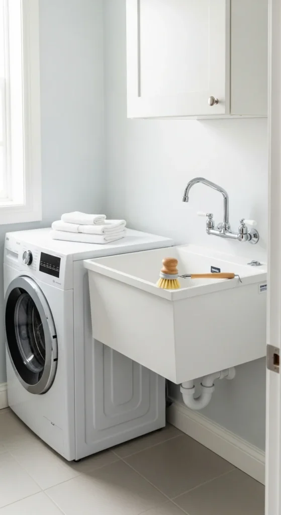 A small utility sink is helpful for pre-treating stains, rinsing muddy items, or hand-washing delicate fabrics. Even in a tight laundry room, a slim wall-mounted sink can fit beside the washer or in a corner. Look for a deep basin that prevents splashes and keeps water contained. Pair the sink with a narrow shelf above it to hold soap, brushes, and stain remover bottles. If plumbing work feels overwhelming, consider a portable utility sink that connects to existing water lines. The sink turns your laundry area into a multi-purpose cleaning station without requiring much floor space. Having water access nearby also reduces trips to the kitchen or bathroom when dealing with tough stains.