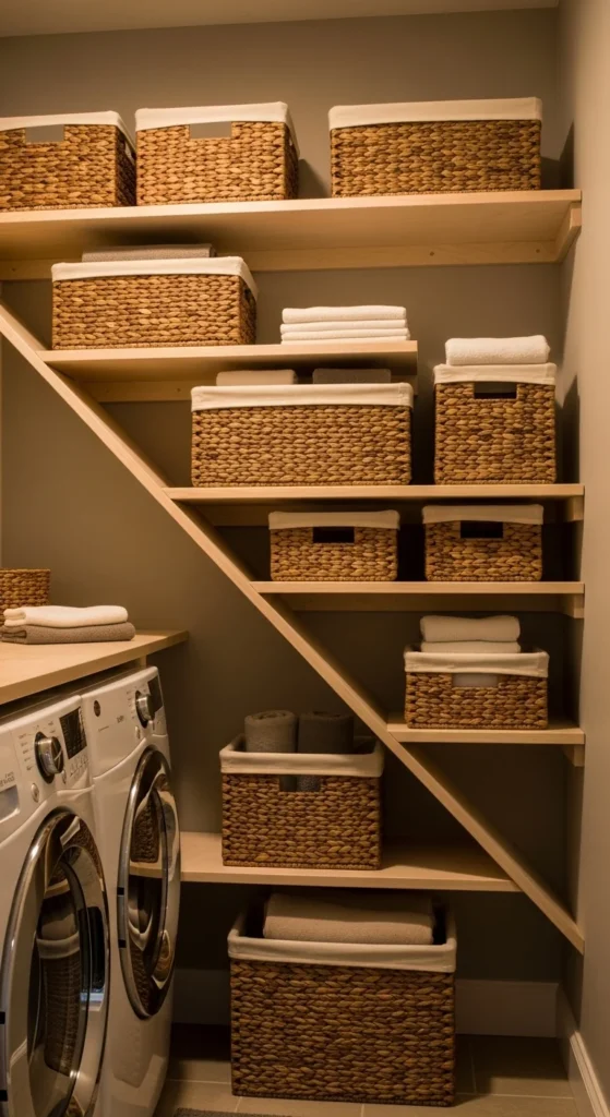 Angled shelving makes it easier to slide baskets in and out, especially in tall narrow spaces. The slight tilt prevents baskets from slipping forward while keeping contents visible. This setup works well for sorting clean laundry by person or category. Install the shelves vertically along one wall to keep the floor clear. Lightweight baskets with handles are easiest to manage. Labeling each basket adds another layer of organization. Because the shelves are open, the system feels lighter than bulky cabinets and keeps air circulating around stored items.