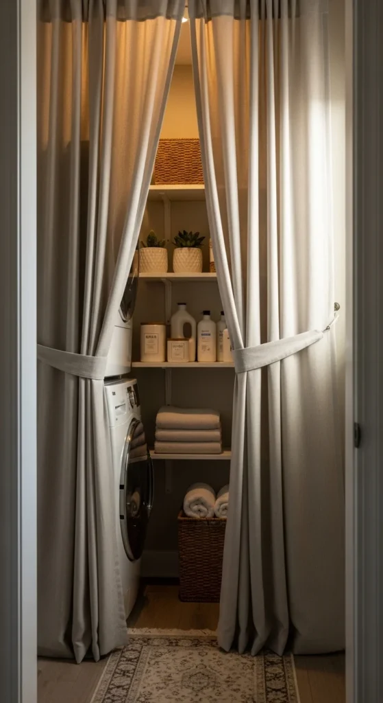Open shelves can look messy even when items are organized. A simple curtain softens the look and hides visual clutter. Use a tension rod and lightweight fabric for an easy, low-cost solution. Curtains are also helpful in open-plan homes where the laundry area is visible from other rooms. Choose a washable fabric so it stays clean over time.
