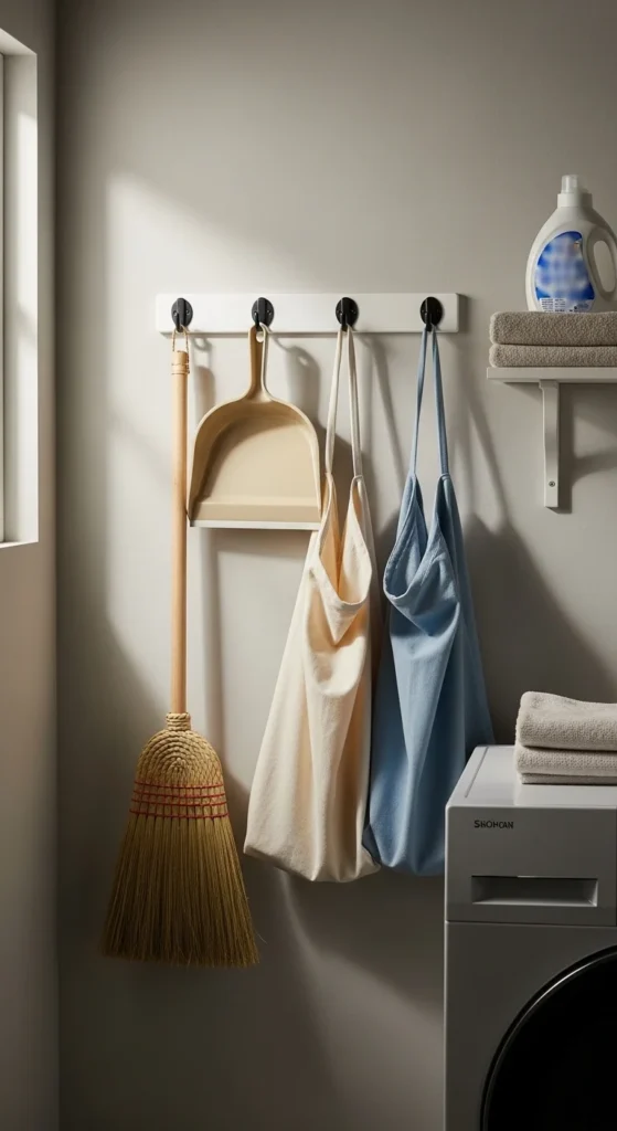 Hooks keep brooms, dustpans, and reusable laundry bags off the floor and easy to reach. Install them on narrow wall strips or behind the door. This vertical storage method keeps long items tidy without taking up shelf or cabinet space.