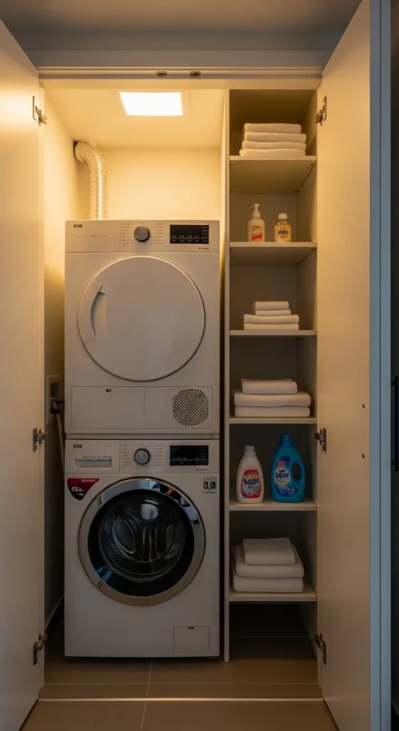 Stacking your washer and dryer instantly frees up floor space that can be used for storage or folding. This layout works especially well in closets and narrow rooms where side-by-side machines take up the entire width. Front-loading models are made for stacking, and most brands sell kits that secure the units safely. With appliances arranged vertically, you can add a slim cabinet, rolling cart, or open shelving beside them. That narrow strip of space becomes valuable storage instead of wasted air. Keep a small folding step stool nearby if reaching the dryer feels high. Choose one that folds flat and slides beside the machines. Stacking also makes the room feel taller and less crowded. When you eventually replace old machines, planning for a vertical setup is one of the smartest long-term space-saving moves.