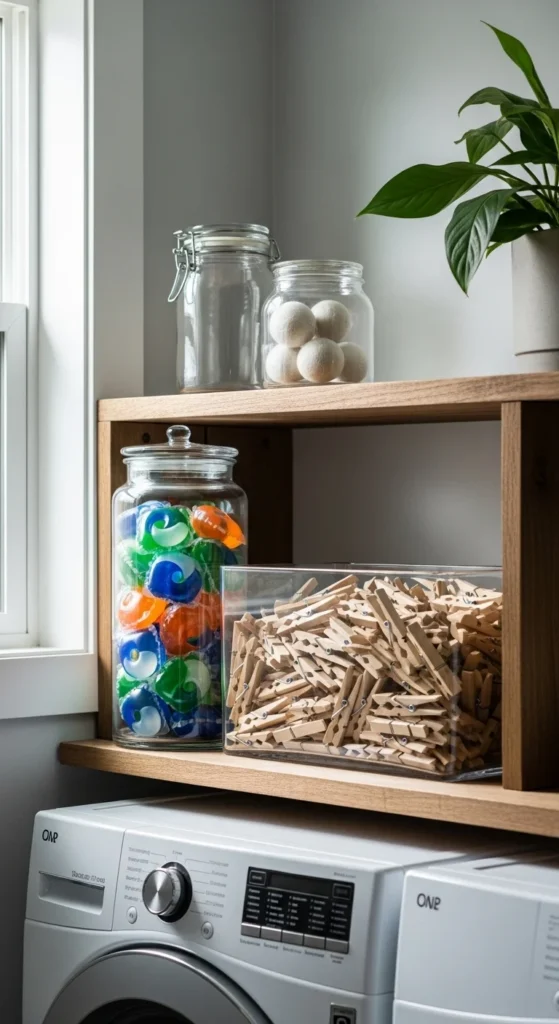Clear containers make it easy to see how much detergent or supplies remain. They also create a uniform, tidy appearance on open shelves. Choose airtight lids for pods to keep moisture out. Group similar items together in matching bins to reduce visual clutter.