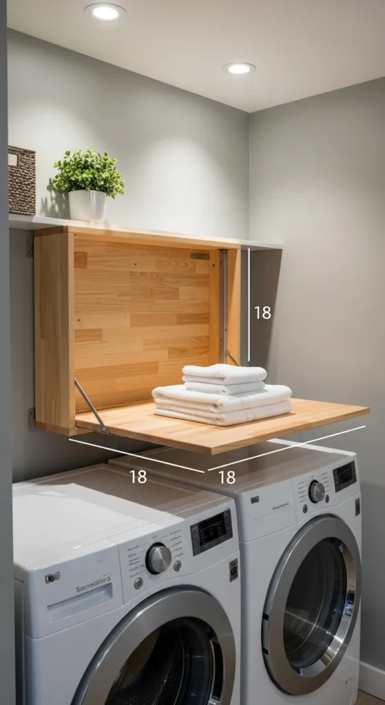 A fold-down ledge adds temporary counter space without permanent bulk. Install it on an open wall near the machines. Use sturdy hinges and brackets that lock into place when extended. Fold it flat when not needed to keep pathways clear.