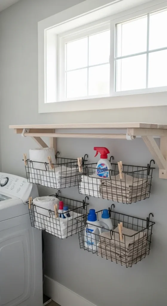 Under-shelf baskets attach beneath existing shelves and use vertical gaps that often go wasted. They are perfect for storing small items like cloths, dryer sheets, or cleaning brushes. This addition increases storage without adding new furniture.