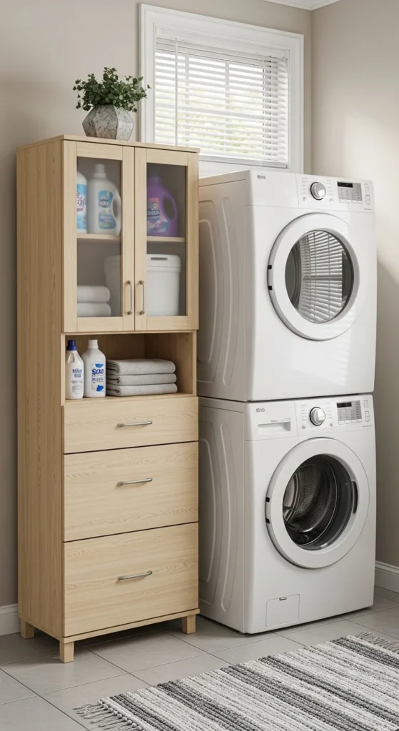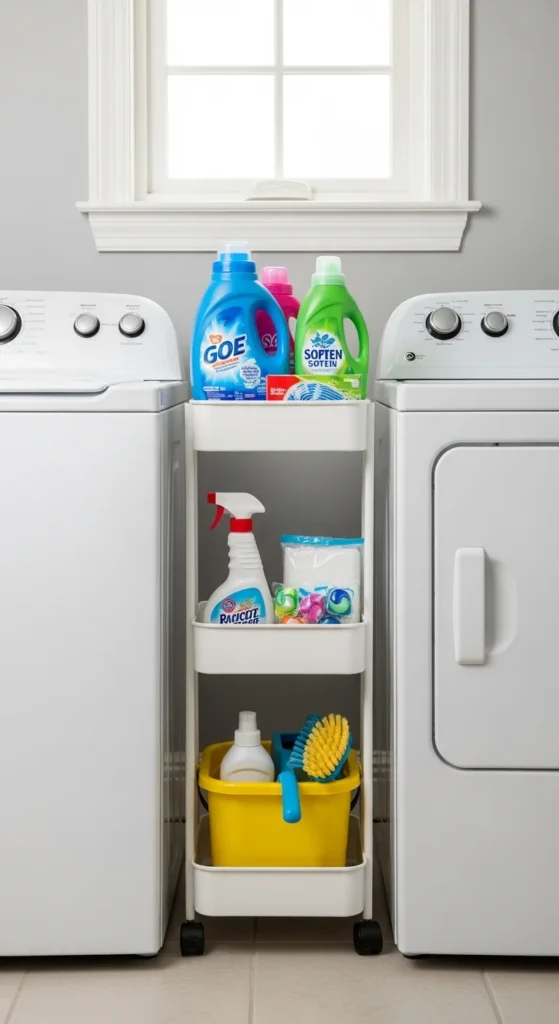 A slim rolling cart can slide into the narrow gap between machines or between a machine and the wall. This small strip of space often goes unused, yet it is perfect for vertical storage. Choose a cart with multiple tiers to hold detergents, sprays, dryer sheets, and stain removers. Wheels make it easy to pull out when you need something and slide it back when you are done. Metal or plastic carts are affordable and easy to clean if spills happen. Add small bins on each shelf to keep items grouped and prevent tipping. This mobile solution keeps supplies close without crowding shelves or countertops.