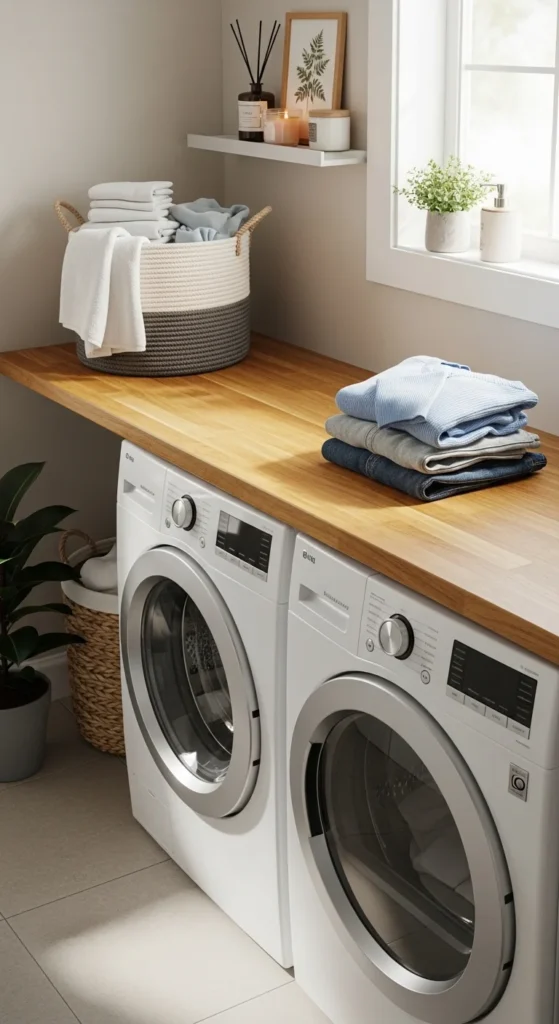 A countertop placed over front-loading machines creates an instant folding station without using extra floor space. This surface makes sorting and folding much easier and prevents clean clothes from piling up elsewhere in the house. Butcher block, plywood with laminate, or even a sealed solid wood board can work. Many home stores cut wood to size, making installation simpler. Secure the top with brackets on the wall behind the machines for added stability. If your machines vibrate, add small rubber pads between the counter and appliance tops. Keep the counter clear except for a small basket or tray for loose items. This simple surface upgrade turns your machines into part of the workspace rather than obstacles in the room.