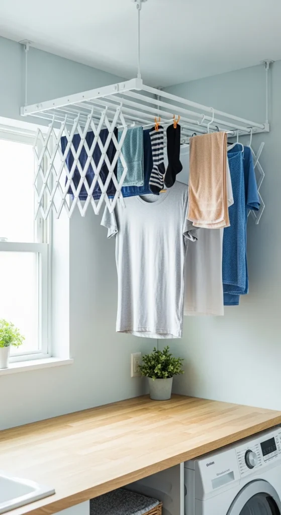 Air-drying racks can take over the floor in small spaces. A wall-mounted drying rack solves that problem by folding flat when not in use. Install it above a countertop or on an empty wall so wet items drip safely. These racks work well for delicates, workout gear, and items that should not go in the dryer. Many models fold out like an accordion and collapse to just a few inches deep. Installation requires only basic wall anchors and screws. When folded away, the rack almost disappears, keeping the room open and easy to move through.