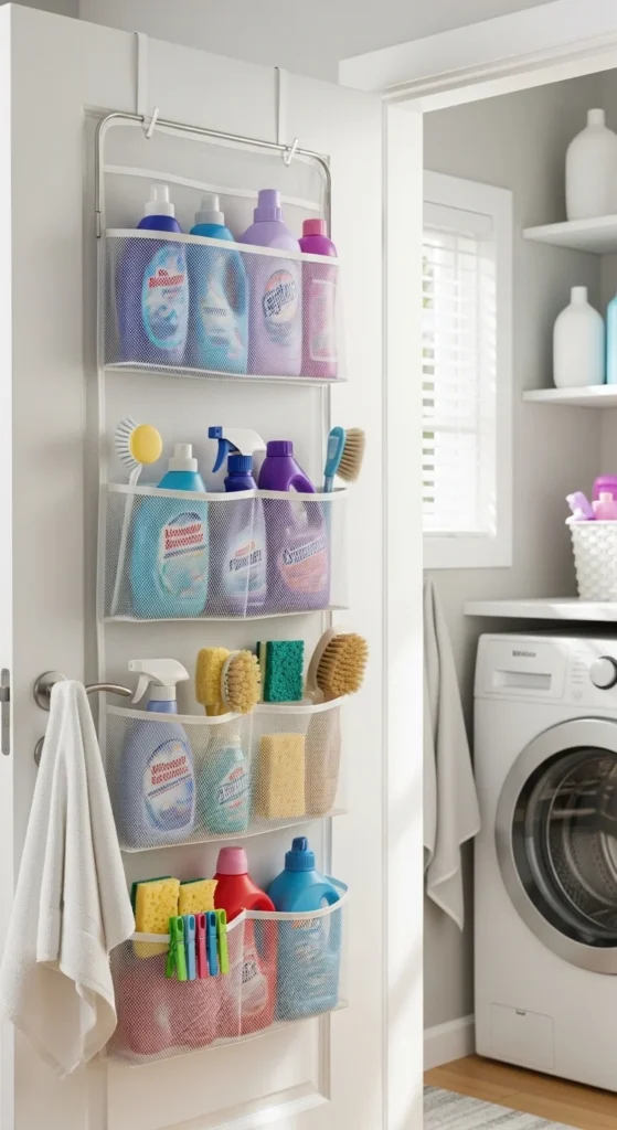 The back of a laundry room door offers vertical storage that costs almost nothing to use. Over-the-door organizers with pockets or small shelves hold dryer sheets, stain sticks, and cleaning tools. This option works well for renters because it requires no drilling. Choose clear pockets so you can see items at a glance. Keep heavier products on lower pockets for balance. This hidden storage area reduces clutter on shelves and keeps small items from getting lost.