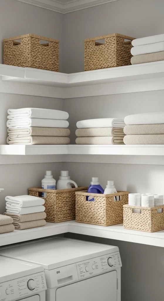 Corners often sit empty because standard shelves do not fit well. Corner shelves turn those tight angles into practical storage. Use them for folded towels, small baskets, or decorative jars. Floating corner shelves are easy to install and help draw the eye upward, making the room feel taller. Keeping items light and neatly arranged prevents the corner from feeling heavy.