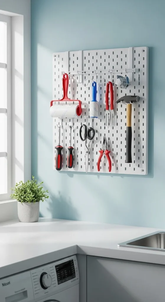 A pegboard keeps small tools organized and off surfaces. Mount one on an empty wall and add hooks for scissors, lint rollers, measuring spoons, and small baskets. Painting the pegboard the same color as the wall keeps it from standing out too much. This flexible system lets you rearrange hooks as your needs change.