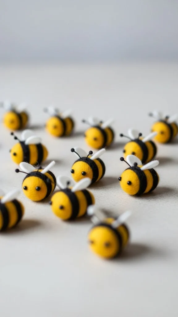 Cut small oval shapes for the bodies and add black felt stripes. Attach tiny white felt wings with glue. Felt bees can be hung on garlands or placed in wreaths. Slight variations in size and wing placement give them a playful, handmade charm. This is a fun, simple project for beginners to practice cutting and layering.
