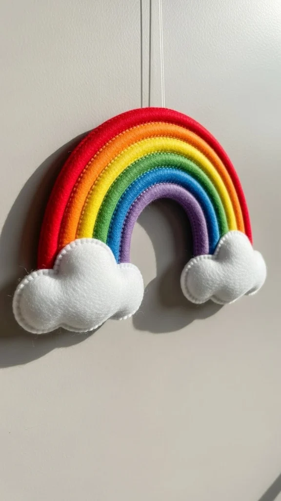 Cut colored felt strips in rainbow order and layer them for a simple wall hanging. Glue soft white felt clouds at both ends. Hang with ribbon or string for cheerful décor. It’s quick, fun, and beginner-friendly. Felt scraps make it affordable while allowing creative color combinations.